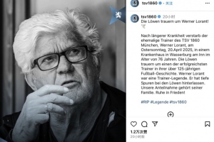 体育资讯4月21日讯 慕尼黑1860俱乐部今日发布讣告,球队前主帅、曾执教过辽宁宏运的德国籍教练维尔纳-洛兰特因病去世,享年76岁。